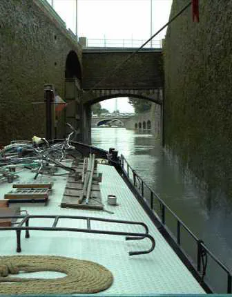 Die Rückfahrt von St. Denis zum Port de l’Arsenal verläuft in einem weiten Bogen über 30 Flusskilometer, durch eine grosse Schleuse und unter zahlreichen Brücken hindurch, an La Defense, Eiffelturm und der Ile de la Cité vorbei.
