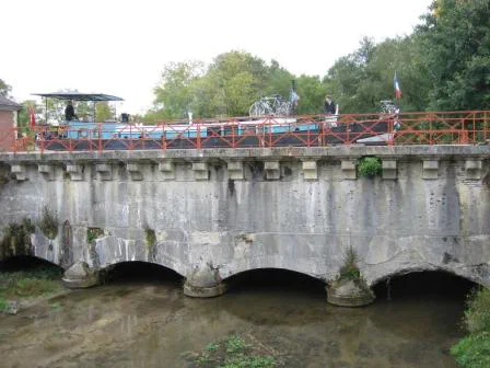 Schrägwandschleuse um Schrägwandschleuse arbeiten wir uns hoch und geniessen die Natur bis wir schliesslich Pont-sur-Yonne erreichen. Wir machen am langen Schwimmsteg unterhalb der neuen Brücke fest. Vor Jahren hatte der Schwimmsteg noch Ausleger, die Schiffe lagen beinahe quer zum Fluss und an Land gab es ein WC/Dusche-Häuschen. Heute sind die Ausleger weg, der Steg gammelt langsam vor sich hin und so etwas wie “Hafeninfrastruktur” ist nicht mehr vorhanden. Hier ist offenbar schon früher manchmal etwas abhanden gekommen, denn auch von der alten Steinbogenbrücke über die Yonne stehen nur noch drei Bögen am linken Flussufer. (Seit 2011 gibt es in Pont-sur-Yonne zwei schöne, neue Schwimmstege und bieten Platz für einige Schiffe)