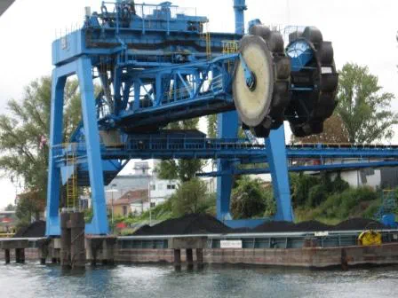 Ein Leichter mit über 2600 Tonnen Kohle liegt unter dem Entladebagger bereit. Der Leichter wird an Drahtseilen vor oder zurückgezogen und der Schaufelradarm kann während des Entladens seitlich verschoben werden. So ist ein ferngesteuertes regelmässiges Entladen Möglich. Dabei schwimmt der Leichter immer waagerecht und die Schaufelräder können ihn fast reslos entleeren, was viel Zeit und Handarbeit spart. Über das Förderband gelangt dann die Kohle direkt zum Kraftwerk in Ufernähe. (Foto 2011)