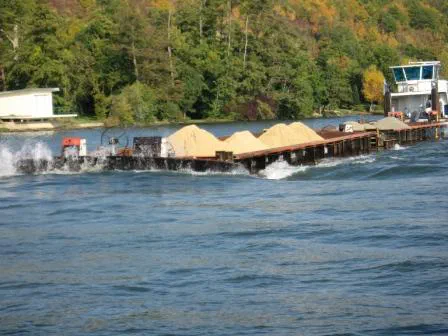 Dieser Frachter ist schon beladen und liegt tief im Wasser. Der dazugehörende Leichter (er wird vorgespannt und geschoben) wird soeben beladen und wird dabei in seiner Rumpfstruktur stark belastet. Es ist erstaunlich, wie unregelmässig beladen und entladen werden kann/darf. Dieser Leichter hat ein V-förmiges Heck um bei der Vertäuung vor dem Frachterbug besseren Halt zu bekommen. (Foto 2011)