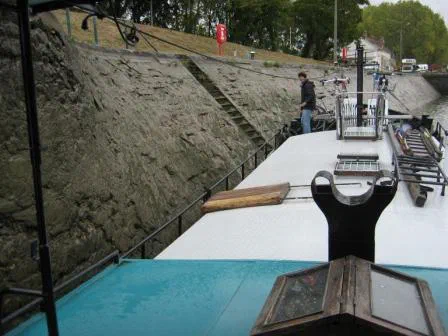 An der Yonne gibt es viele Schleusen mit schrägen Wänden. Ich finde die Dinger eigentlich doof! Vor einigen Jahren wurden in den meisten Schleusen auf der linken Seite Schwimmstege montiert. An ihnen kann man festmachen und sie erleichtern den Freizeitkapitänen das Schleusen. Wir werden vom einen Schleusenwärter aufgefordert dort zu belegen und schon der nächste Eclusier verbietet uns das strikt, weil wir zu schwer seien. Um die Diskussionen zu beenden, beschliessen wir, gut gefendert gegen das Bugbelegtau leicht “einzudampfen”. Das funktioniert für Bergfahrer problemlos. Beim Talfahren muss man darauf achten, immer von der schrägen Wand frei zu bleiben. So oder so sind die Distanzen um Taue auszulegen oder einzuholen in diesen Schrägwandschleusen gross und Taue die mit der verschlammten Wand in Berührung kommen sind schnell glitschig, unangenehm anzufassen und rufen nach Reinigung. Gefährlich wird es, wenn man versucht, eine der in die Schrägwand eingelassenen Treppen zu begehen! Diese Schleusenbauart verbraucht auch viel mehr Wasser als eine Schleuse mit senkrechten Wänden. Im Fluss spielt das eigentlich keine Rolle, aber der Schleusenvorgang dauert bedeutend länger.
