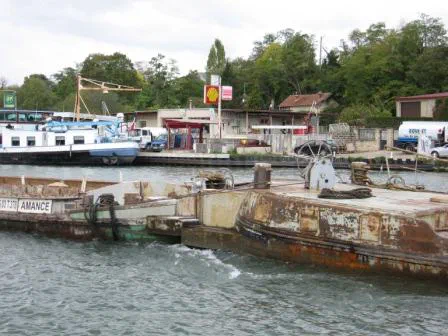 Die einzige Wasser-Tankstelle weit und breit wird rege besucht. Auch wir haben hier schon öfters einige hundert Liter Diesel nachgefüllt. Heute liegt ein Frachter flussabwärts an der Tankstelle. Flussaufwärts ist der Bug des Frachters “Amance” zu sehen, wie er seinen Leichter vor sich herschiebt. Der “Leichter” ist eine alte Peniche. Ihr wurde das Steuerhaus abmontiert und im Wohnraum im Heck des Schifffes wurden die Fenster zugeschweisst. Teilweise sind ausgemusterte Penichen so günstig zu kaufen, dass es sich lohnt sie zum Leichter umzubauen. (Foto 2011)