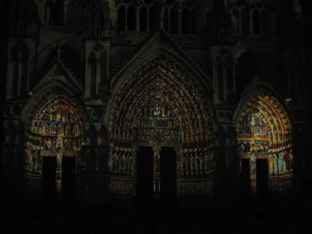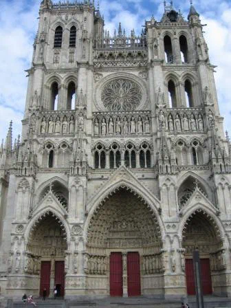 Hinter dieser Fassade erstreckt sich der grösste Sakralbau in ganz Frankreich. Das Volumen der Kathedrale von Amiens ist so gross, dass die Notre Dame von Paris zwei Mal darin Platz finden würde. Der Dachritter, der Turm auf dem Kreuz von Längs- und Querschiff, soll sogar der höchste der Welt sein! Als Touristenattraktion wird im Sommer die Fassade mit farbigem Licht so präzise angeleuchtet, dass die Sandsteinstatuen wie bemalt aussehen.