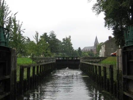 Die “Barone” haben ein paar Tage vor uns die Somme befahren und sind wieder auf dem Rückweg. Es ist kurz vor Mittag, aber der Schleusier ist so freundlich und schleust uns noch durch die Doppelschleuse. An der unteren Somme gibt es einige Doppelschleusen und dies obwohl der Totalhub jeweils nur 1,2 bis 2.7 Meter beträgt. Beim jetzigen geringen Wasserstand im Sommetal wird nur in einer Schleusenkammer geschleust und die andere Kammer steht offen.
