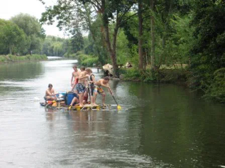 Mit drei bis vier Stundenkilometer tuckert unser Schleppverband langsam westwärts. Natürlich wird viel geplaudert - woher, wohin, Pfadinamen werden ausgetauscht und, wenn wir nach Amiens wollten so könnten wir sie gleich bis dahin mitziehen, denn sie hätten das selbe Tagesziel. Ohnehin fühlen sie sich uns sehr verbunden. “Wir sind auch eine Gemeinschaft von Schiffseignern”, stellen sie fest. Ich mache mir in den Rechtskurven manchmal etwas Sorgen um den eintauchenden Steuerbordbug des Flosses, werde aber umgehend aufgeklärt: “Das Fass vorne rechts hat eventuell ein kleines Leck, deshalb schwimmt es etwas tiefer, aber das ist kein echtes Problem”. Selbstverständlich beruhigt mich das enorm. Da die Jungs aber vom hintern Flossteil ins Wasser springen und auch dort wieder aufs Floss klettern wird der Bug immer wieder entlastet.