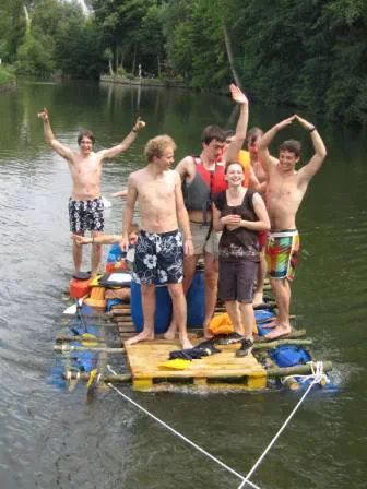 Am Nachmittag erkunden wir die Stadt, verweilen auf einer Parkbank am Weiher eines ehemaligen Klosters und ziehen weiter den Geschäften und Schaufenstern entlang. Nach der Besichtigung der Kirche mit grosser Fassade, kleinem dahinter liegenden Schiff und schönen Glasfenstern, treffen wir am Abend im Supermarkt die flossfahrenden Pfadis wieder. Sie sind inzwischen auch am Ziel ihrer Reise angelangt.