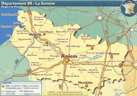 Die Somme entspringt in Fonsommes im Departement Aisne nur 80 Meter über Meer. Ihr Weg nach Westen bis zum Hafenstädtchen Saint-Valery am Ärmelkanal beträgt aber 245 Kilometer. Von der Quelle bis zur nahen Stadt St-Quentin hat die Somme noch nichts mit der Schifffahrt zu tun.