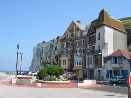 Das Städtchen mit seinen Backstein / Riegelhäusern schmiegt sich an den Kalksteinfels. Vom Hafen hinauf führt uns der Weg durchs alte Stadttor und die Gassen hinauf bis zur Kirche. Rechts unter uns liegt der Hafen, der gleichzeitig die Mündung der Bresle ist. Vor uns liegt der Vorhafen und links davon der Leuchtturm - und gleich daneben, an bester Lage, steht das Casino. Gegen Südwesten berühren die letzten Häuser den Kalksteinfels der hier senkrecht empor ragt. Wer nicht hinaufsteigen will, kann sich mit der Standseilbahn chauffieren lassen.
