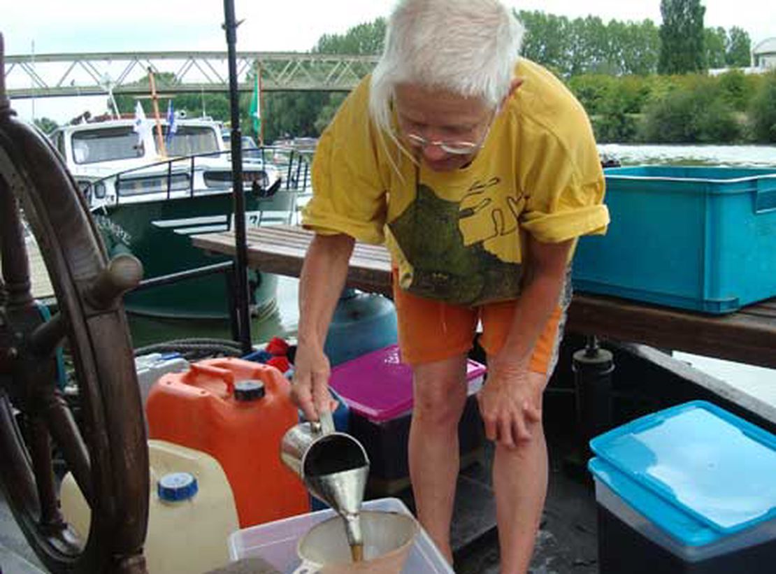Das abgepumpte Diesel steht in behelfsmässig improvisierten Behältern auf Deck