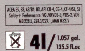 Detailauschnitt der Rückseite einer Ölflasche. ACEA-, API- und weitere Qualitätsbezeichnungen.