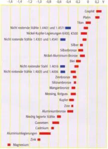 - Es muss immer genügend Sauerstoff vorhanden sein, damit sich die Chromoxidschicht auf der Oberfläche laufend erneuern kann. Dieser notwendige Sauerstoff (O) wird dem Wasser (H2O) entzogen. Auf dem Bild der galvanischen Liste ist zu sehen wie die nicht rostenden Stähle an Qualität verlieren können. Das rote Feld zeigt die Qualität bei genügend Sauerstoff, das blaue Feld zeigt die Qualität der selben Chromstahllegierung in sauerstoffarmem Wasser!