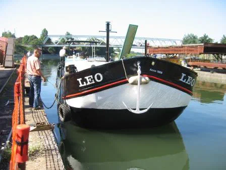 R. E., unterstütz von seiner Frau, dem Vorbesitzer Dieter Hoheisel, dem Vermittler Leo Ullmann und einem Kollegen von R. E. wird “LEO” nach Mulhouse überführt. Kurz vor dem Reiseziel, nach Strassburg bergwärts auf dem Rhein, ist der 160 PS starke MAN-Motor erstmals richtig gefordert und überhitzt sofort! Nur noch unter langsamer Fahrt geht es weiter zum neuen Standplatz bei der Werft „Spinnhirny“ in Mulhouse.