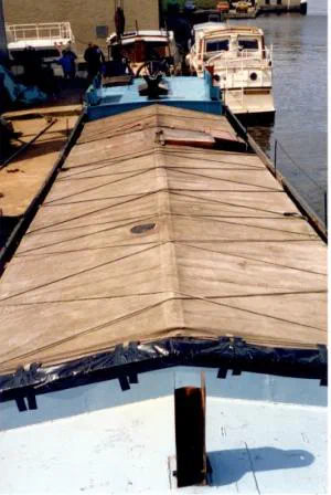 Auf dem blauen Deck der Achterkabine steht bereits der neue Kamin. Der gesamte Laderaum ist noch mit alten Luken abgedeckt. Auf dem festen Vordeck steht die Stütze des hölzernen Flaggenmastes.