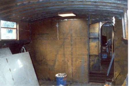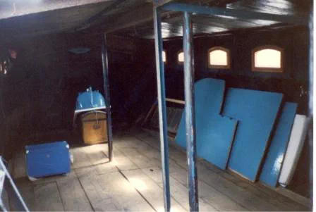 Walter Stamm entfernt die Wände des von Dieter Hoheisel damals eingebauten Bades, und damit auch die Badewanne, das Lavabo und das WC. In der Achterkabine wird der Herd entfernt und an dessen Stelle ein kleiner Tisch über dem Getriebe montiert. Anstatt den Kamin ebenfalls auszubauen, wird die Kaminöffnung nur provisorisch verschlossen. Ein Provisorium, das noch heute unschön auf sich aufmerksam macht. Vor der Achterkabine wird alles oberhalb des Gangbord weggetrennt.