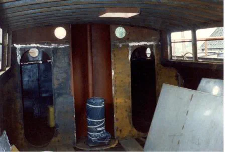 Um Stehhöhe zu erreichen baut R. E. im Winter 1984/85, immer noch in Woudsend, senkrechte Stützen in dem Laderaum ein. Eine Petrollampe vervollständigt die erste Umnutzung vom Laderaum zum provisorischen Wohnraum. Der Herd in der Achterkabine erhält anstelle des hässlichen Baustellenkamins einen neuen Kamin mit Mastauflage, obwohl schon längst kein Mast mehr vorhanden ist. Über einen kleinen, heute noch im Motorraum hängenden Verteilerkasten entnimmt R. E. Strom aus den Motorbatterien, um Positionslampen für die Fahrt zu betreiben.