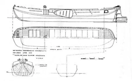 Die Klipperaak. Ältere Klipperaaken wurden noch gesegelt. Der Steuerstand befindet sich hinter dem Wohnraum im Freien. Gesteuert wird an der Pinne. Später wurden Klipperaaken mit Steuerrad und Steuerhaus gebaut.